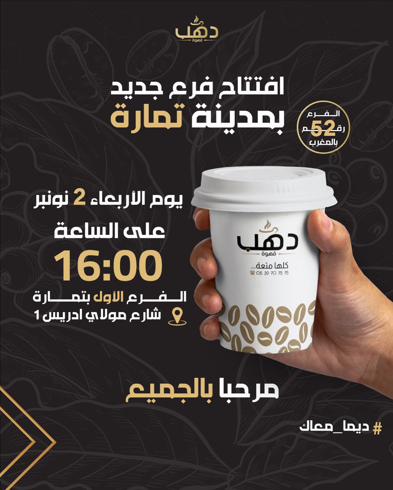 ينتظر أن تفتتح سلسلة شركة ذهب المتخصصة في تسويق حبوب القهوة فرعا جديدا لها يوم الأربعاء 02 نونبر 2022 بمدينة تمارة