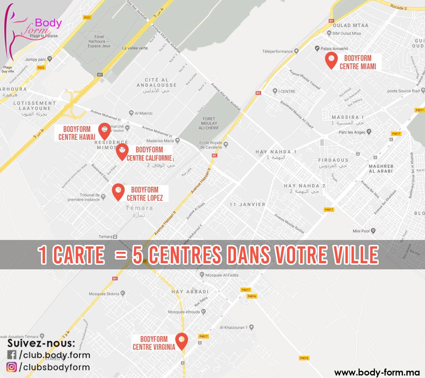 Le Groupe BODYFORM où l’effort ne s’arrête pas, multiplie les bonnes raisons pour faire du sport. Depuis son ouverture en 2011, Le Groupe BODYFORM est devenu le 1er centre de remise en forme à Témara et bientôt au niveau du Royaume. Le choix de la ville de Témara est dû essentiellement à son micro-climat.
