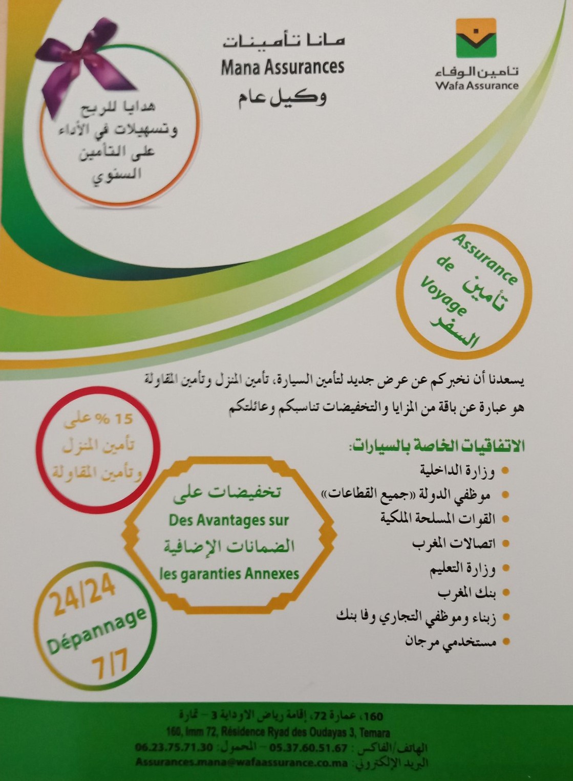 MANA Assurances est un agent agréée Wafa Assurance,la compagnie marocaine d’assurance qui fait partie du groupe Attijariwafa bank. Depuis 2008, l’entité est leader du secteur de l’assurance au Maroc et depuis 2014 dans le monde Arabe.